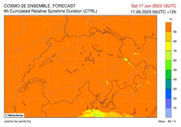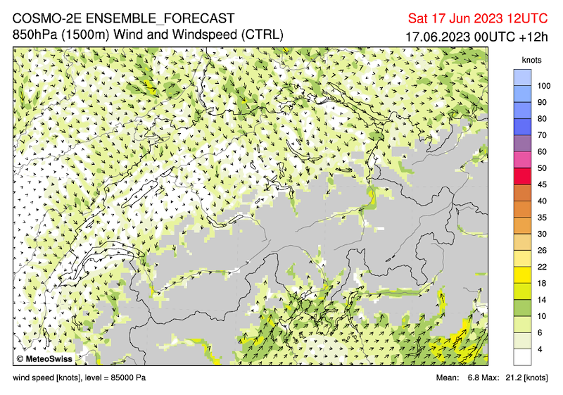 Am frühen Morgen 0.5er Gradient bis 2000, ab 11 Uhr 1-er, gute Thermik, etwas gedämpft durch leichte Warmluftadvektion.