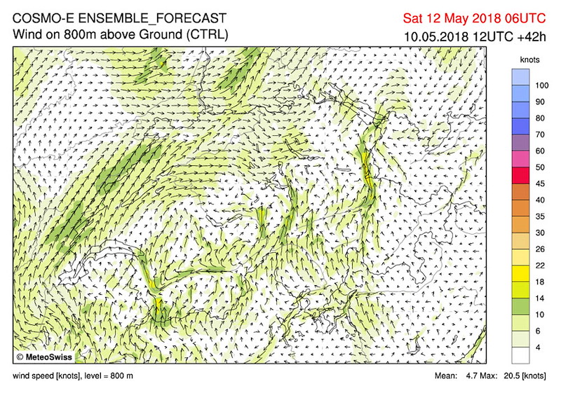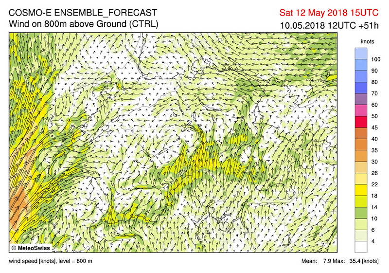 Tendance foehn légère l'après-midi avec 3hp, mais le vent est déjà fort le matin de SW. C'est très agréable à voir sur les cartes de vent (800m/GRD et 2000m).